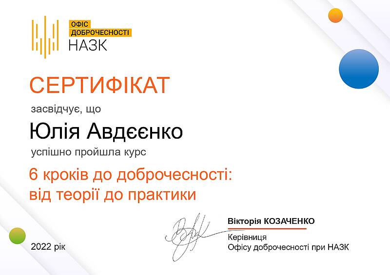 Науково-педагогічні працівники кафедри мовної підготовки у повному складі успішно пройшли курс  "6 кроків до доброчесності: від теорії до практики" і отримали відповідні документи. Нижче наведено вже згенеровані сертифікати.