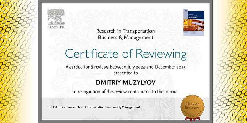 Кафедра «Транспортних технологій» Харківського національного автомобільно-дорожнього університету (ХНАДУ) в межах міжнародної діяльності та роботи факультету транспортних систем інформує про професійне визнання наукової експертизи нашого співробітника. Доцент кафедри Дмитро Mузильов отримав сертифікат ELSEVIER Certificate of Reviewing від журналу Research in Transportation Business & Management за виконання 6 рецензій у період з липня 2024 до грудня 2025 року. Даний Журнал індексується в авторитетних наукометричних базах SCOPUS та Web of Science Core Collection (зокрема, Social Sciences Citation Index, SSCI), що підкреслює високі вимоги до якості рецензування та відбору публікацій у виданнях ELSEVIER рівня Q1-Q2.